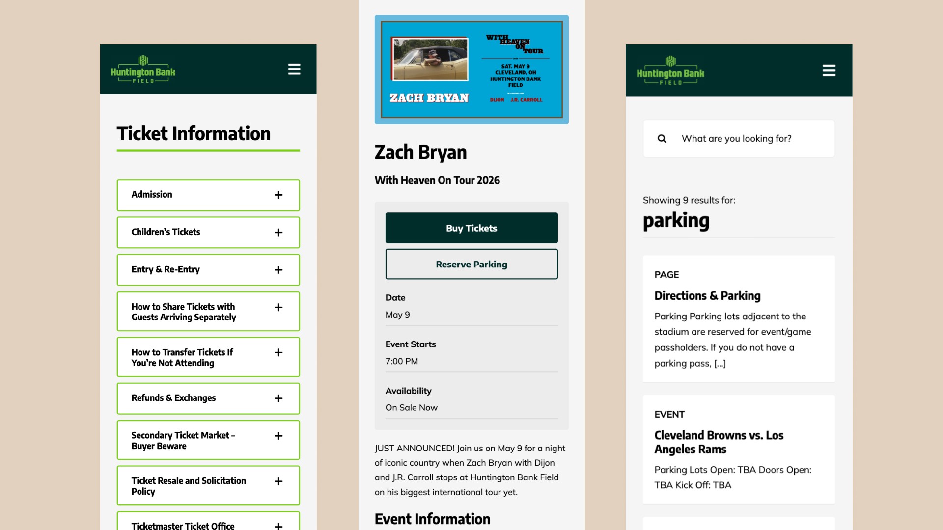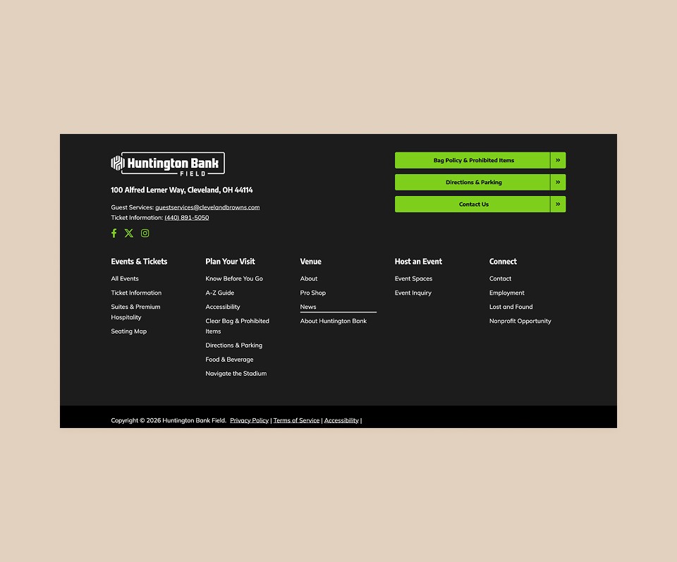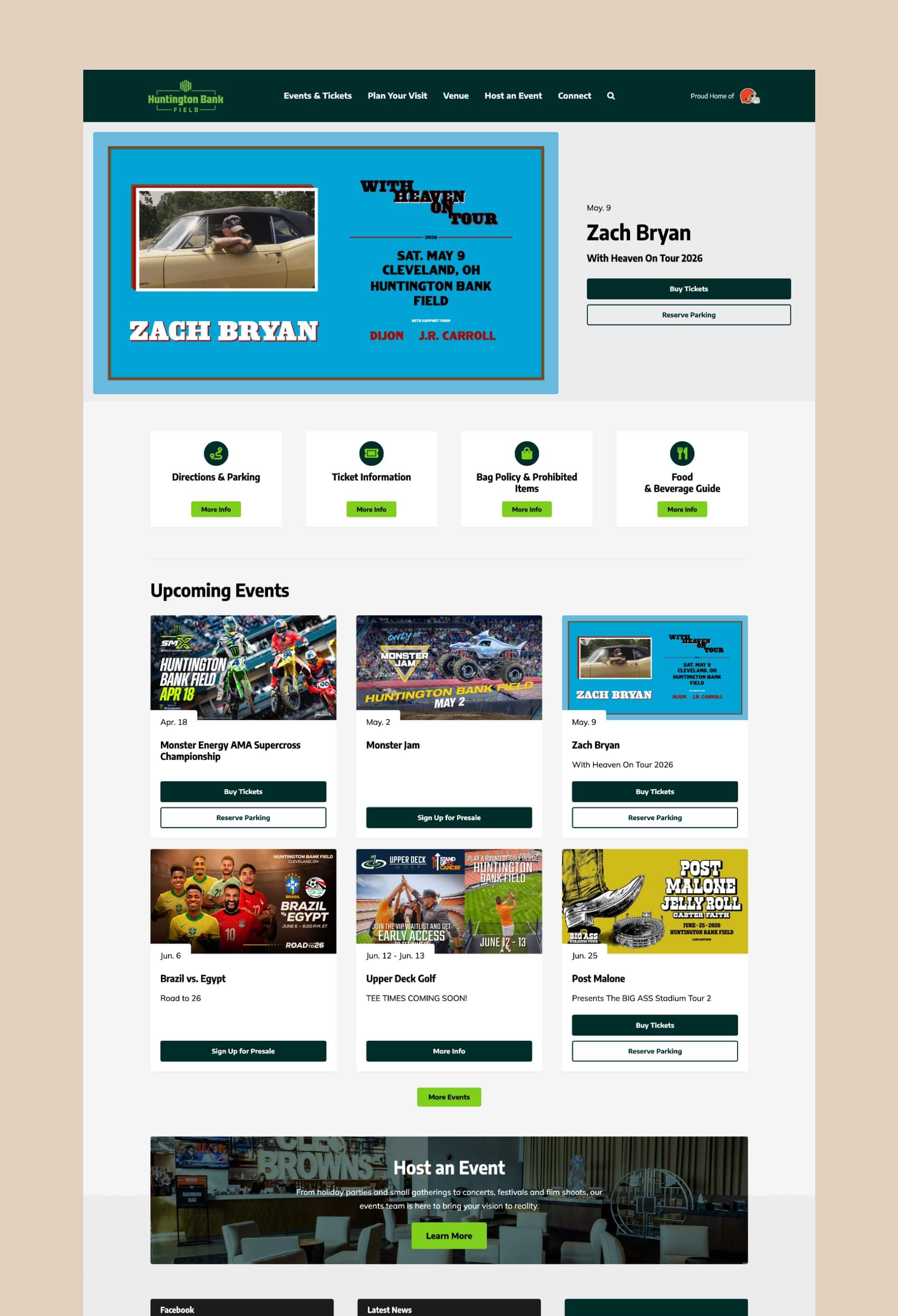 I led the full redesign and rebuild of the Huntington Bank Field website for the Cleveland Browns, creating a cleaner, more consistent, and event-focused experience. The new site improved usability, increased engagement by 20%, and streamlined content management for internal teams.
